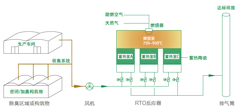 在高溫下(750℃~950℃)將有機(jī)污染物氧化生成CO2和H2O,從而凈化廢氣,并回收分解時(shí)所釋出的熱量,以達(dá)到環(huán)保節(jié)能的雙重目的。RTO設(shè)備采用多個(gè)燃燒室交替運(yùn)行結(jié)構(gòu)型式,并采用陶瓷填料回收熱能,熱回收率大于90%,處理VOC時(shí)不用或使用很少的燃料。若處理低濃度廢氣,可選裝濃縮裝置進(jìn)行預(yù)處理,以降低燃燒消耗。